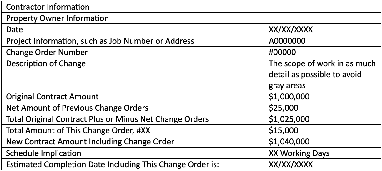 Out of the 15 or so templates I looked at, I only saw one with a tiny little line for duration. But it didn’t clearly say what it should have, which is something like “change order will add XX working days to project schedule.”