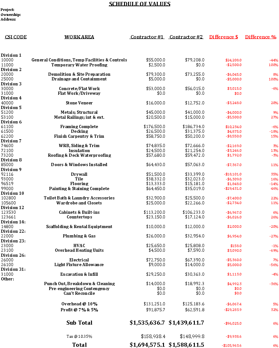 This bid leveling is the same thing a general contractor does to compare sub-contractor bids on multifamily apartment and condo projects. Here’s an example: